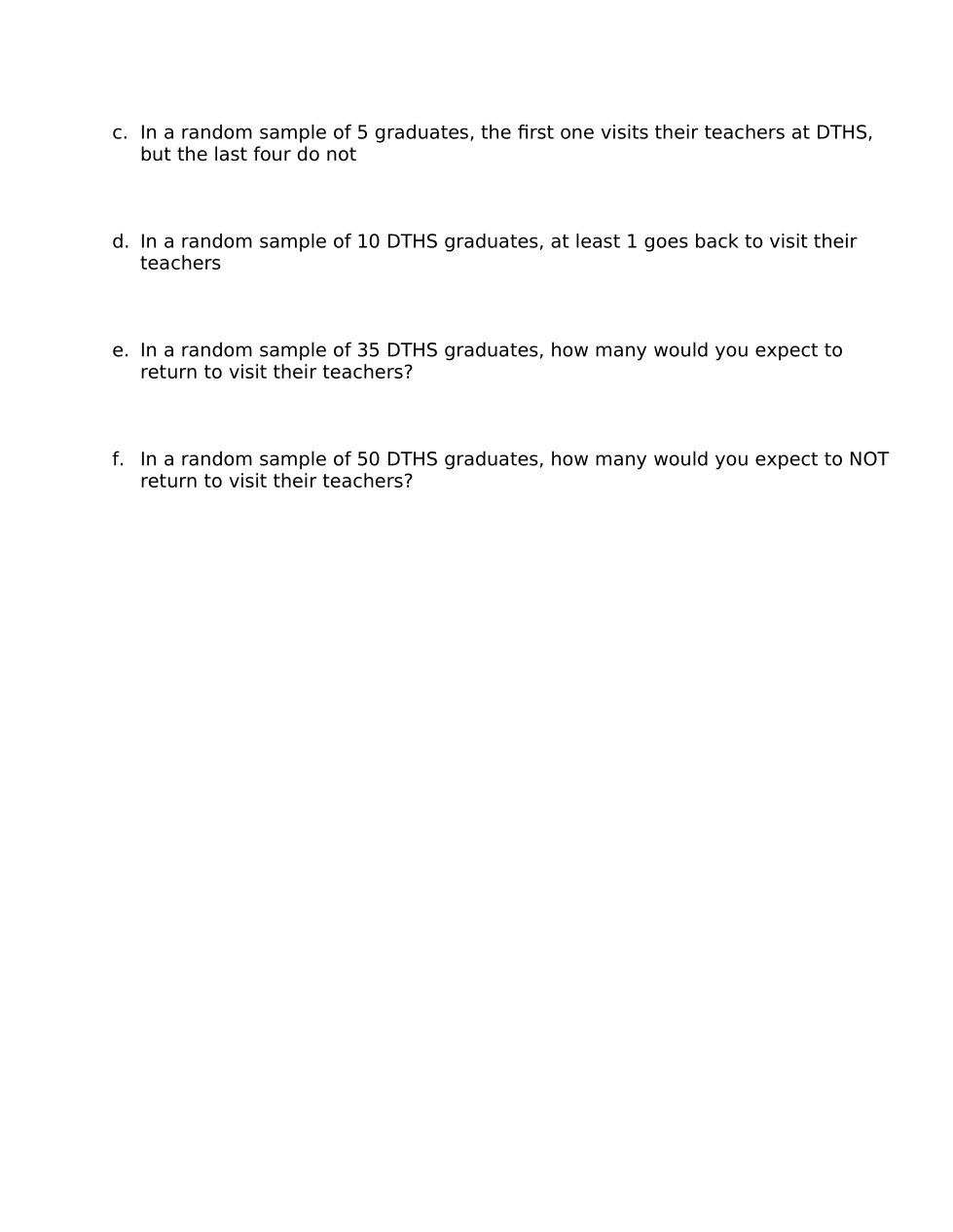 In a random sample of 5 graduates, the first one visits their teachers at DTHS, but the last four do not. Include your calculations leading up to your final answer.