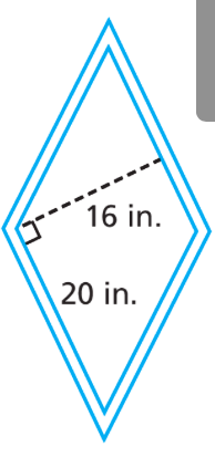 A window is the shape of a rhombus, with each side being 20 inches long. The height of the window is 16 inches. What is the area in square inches of the glass needed for the window?