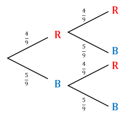 Raheem picks 22 red and blue balls at random. The probability of picking each ball is shown in the tree diagram. Calculate the probability that he selects the same colored ball each time, given that after each time a ball is selected, it is replaced.