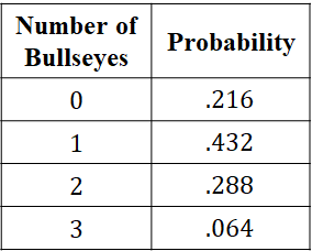 Over time, Ronald has shown that in 4 of 10 attempts he makes a bullseye with a bow and arrow. Create a probability distribution table which shows the possible outcomes and the associated probabilities when Ronald shoots three arrows.