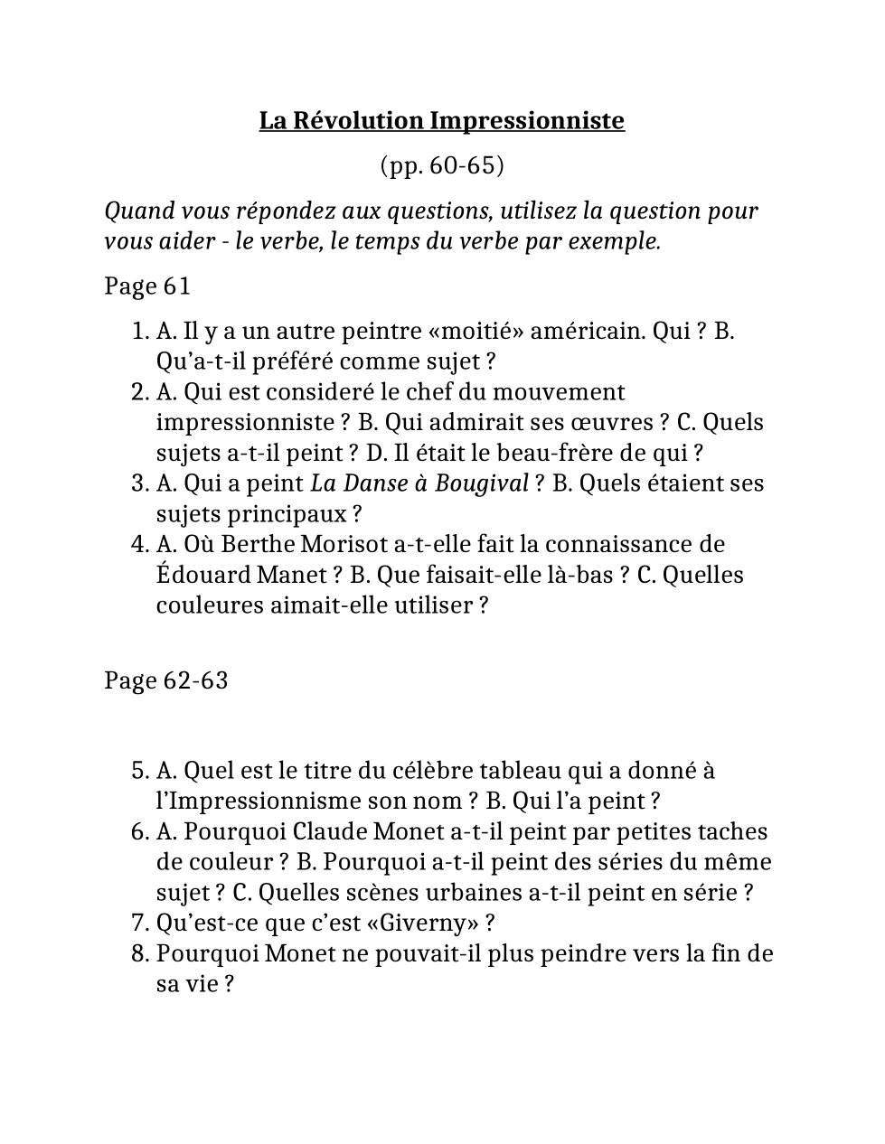 Répondez en phrases completes en français.