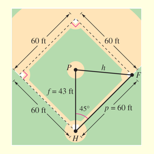 The pitcher’s mound on a women’s softball field is 43 feet from home plate and the distance between the bases is 60 feet (The pitcher’s mound is not halfway between home plate and second base.) How far is the pitcher’s mound from first base? 3Marks