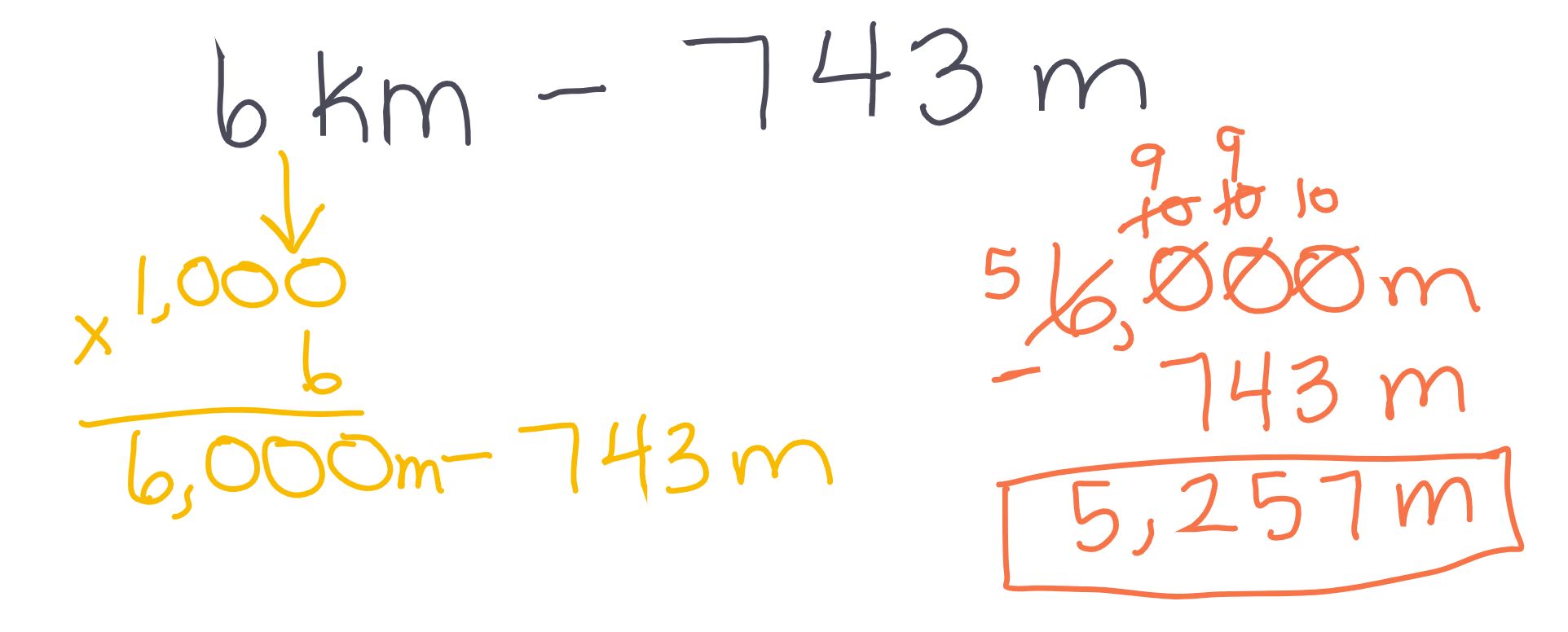 RULE: 1 km = 1,000 m7 km - 429 m = ______________m
