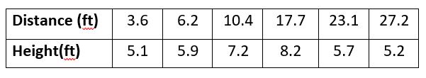 The table below gives the distance a person throws a ball compared to the height of the ball. Use this information to answer this and the next 3 questions.