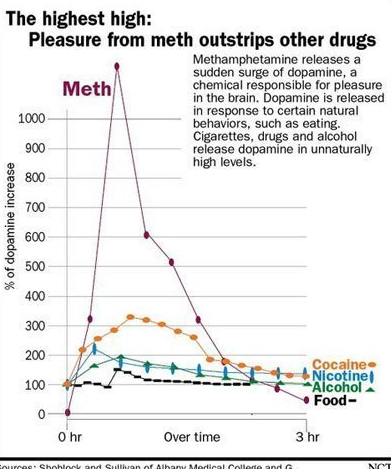 Cocaine and methamphetamine affect the relase of dopamine more than alcohol and nicotine.
