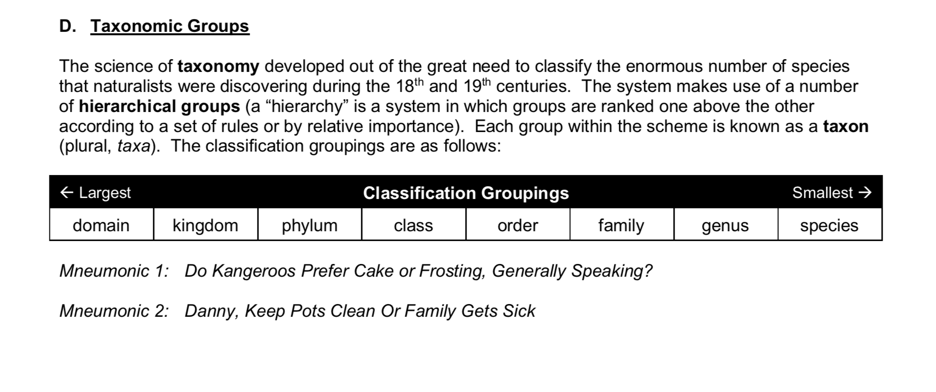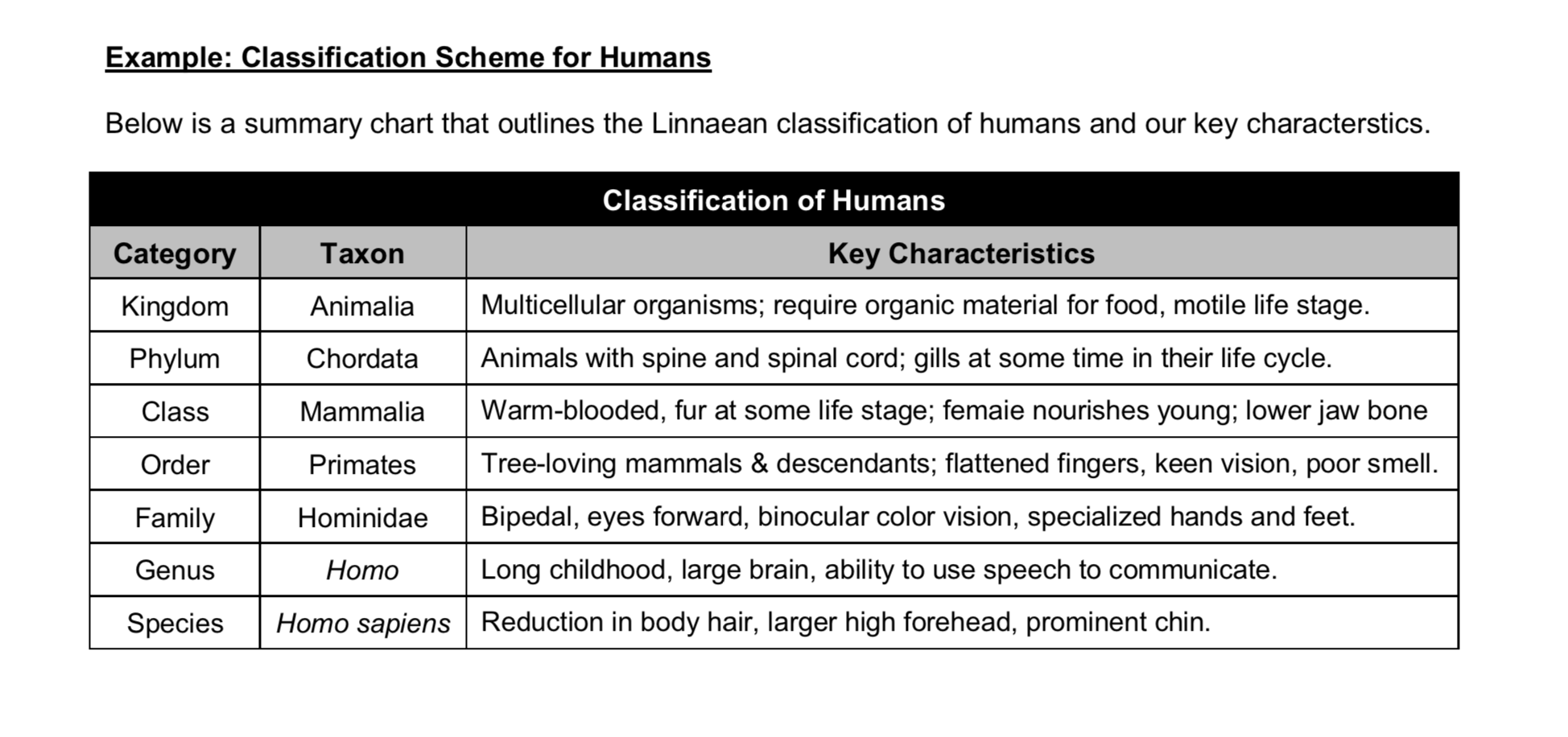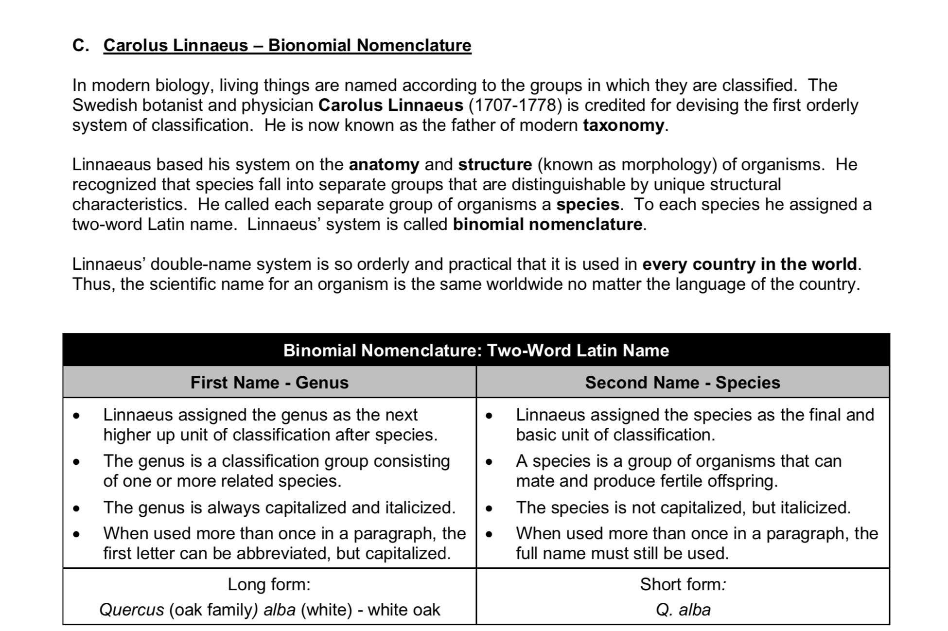 Carolus Linnaeus developed a scientific naming system that is still used today. Fill in the flow chart with details about Linnaean taxonomy.