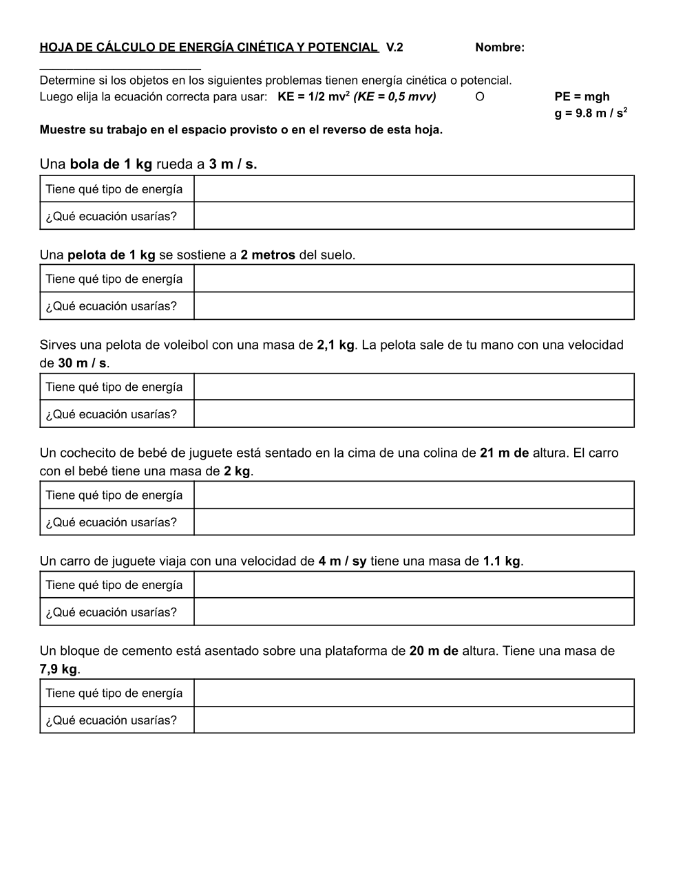 Calculating kinetic and potential energy spanish modified