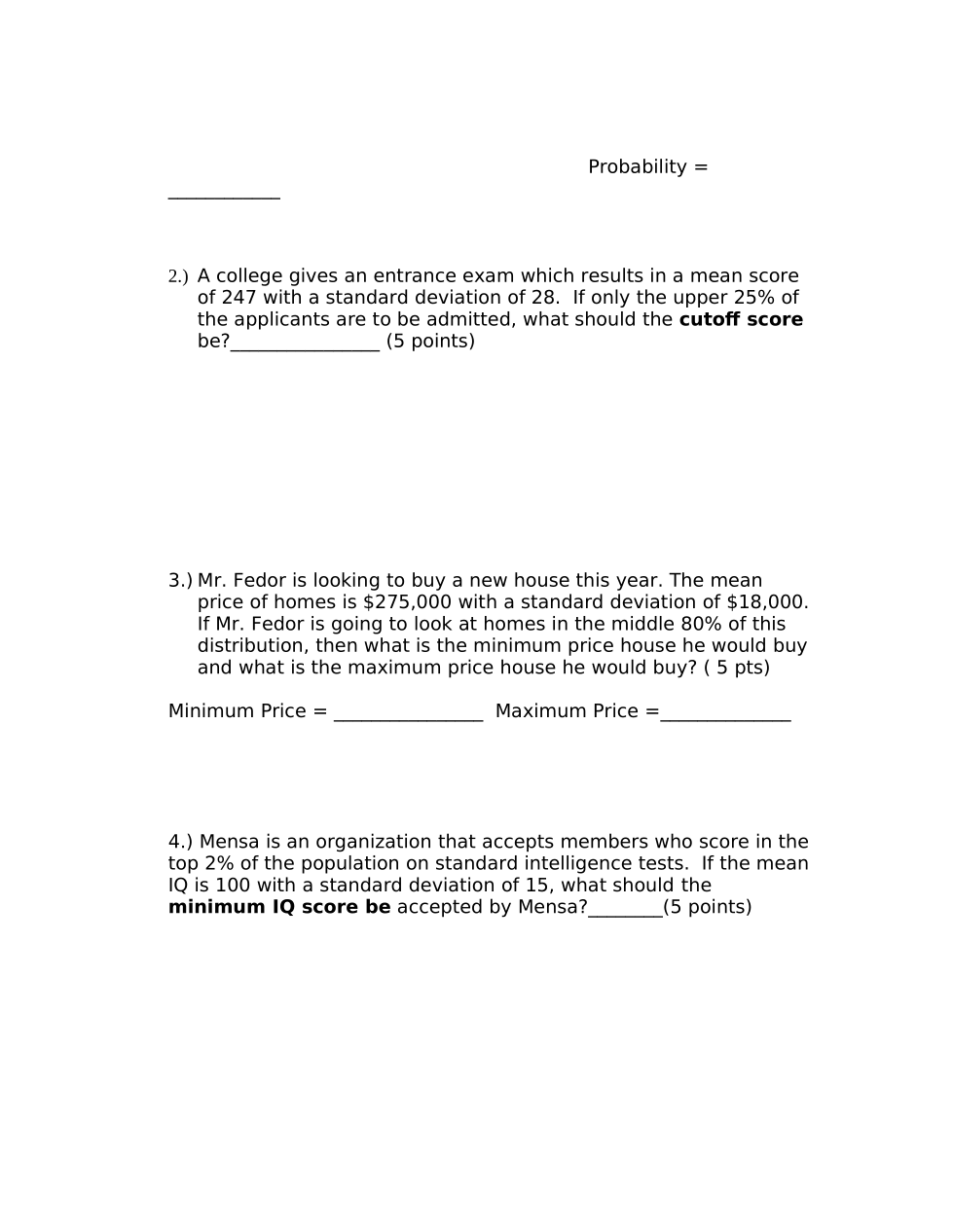 A college gives an entrance exam which results in a mean score of 247 with a standard deviation of 28. If only the upper 25 percent of the applicants are to be admitted, what should the cutoff score be?
