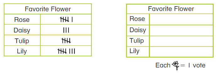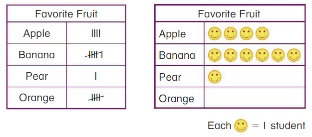 Use the tally chart and drawing tool to complete the pictograph. Then use the pictograph to solve the problems: