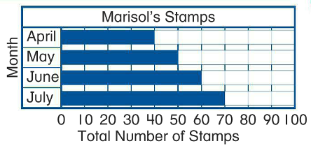 Marisol gets new stamps every month. This graph shows the total number of stamps in Marisol's collection for four months. Which is the best prediction for how many new stamps Marisol will get in August?