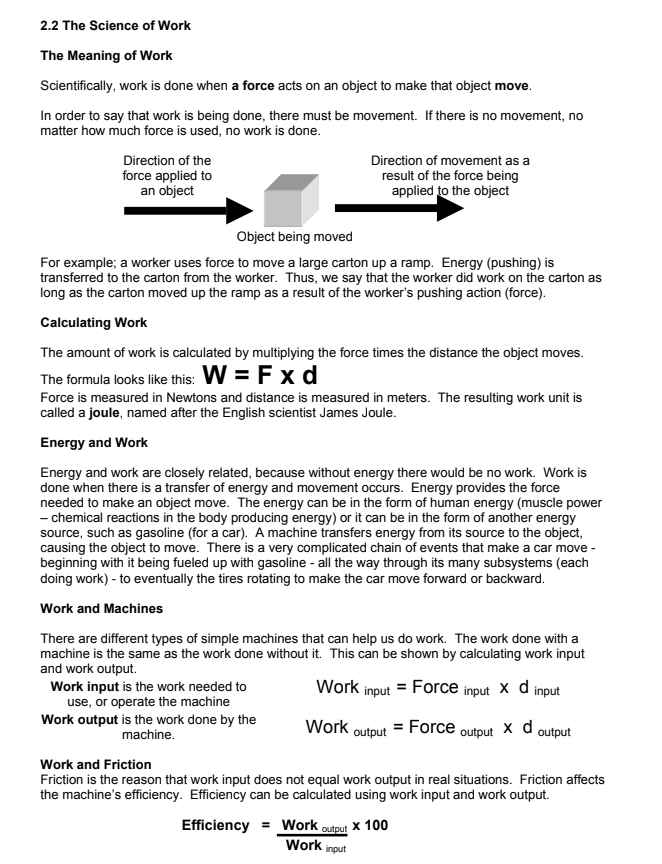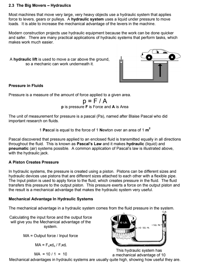 Sci. 8- Mechanical Systems: Section 2.2 The Science of Work & 2.3 The Big Movers-Hydraulics