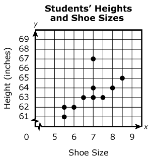 The scatter plot shows the relationship between the height, in inches, and the shoe size of each of 10 students in a class.
