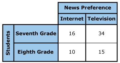A principal surveyed 75 seventh-grade and eighth-grade students. She asked them if they prefer to obtain news from the Internet or to obrain news from television. She created a table to display the data, as shown.