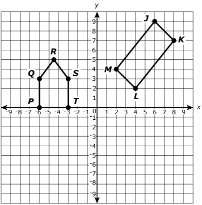 A student plotted pentagon PQRST and quadrilateral JKLM on a coordinate plane, as shown.