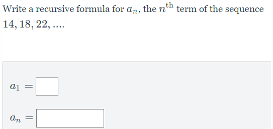 The first three terms of a sequence are given. Write an explicit formula for the terms.10, 14, 18, ...