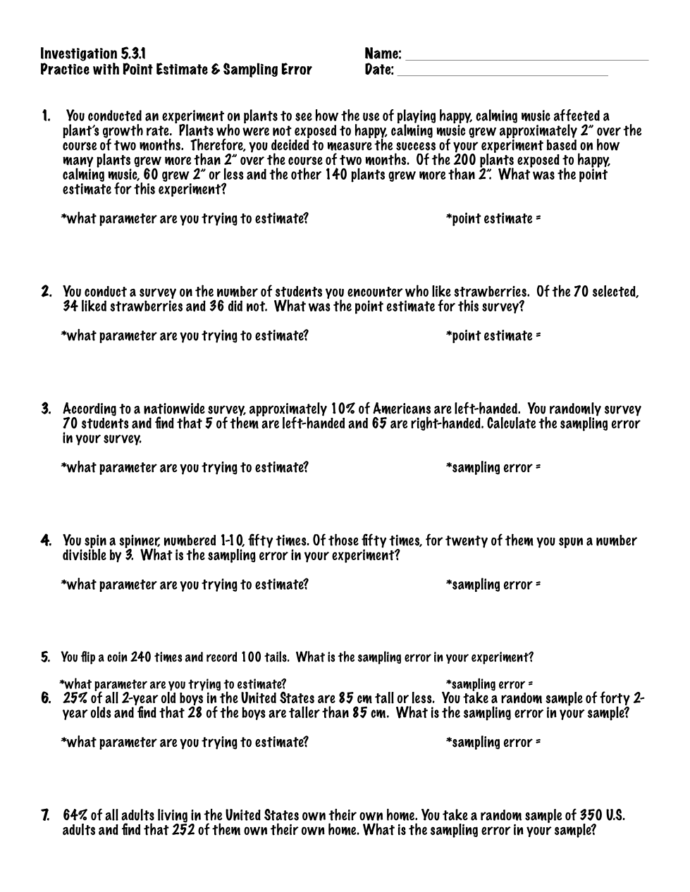 Inv 5.3.1 Practice with Point Estimate and Sampling Error