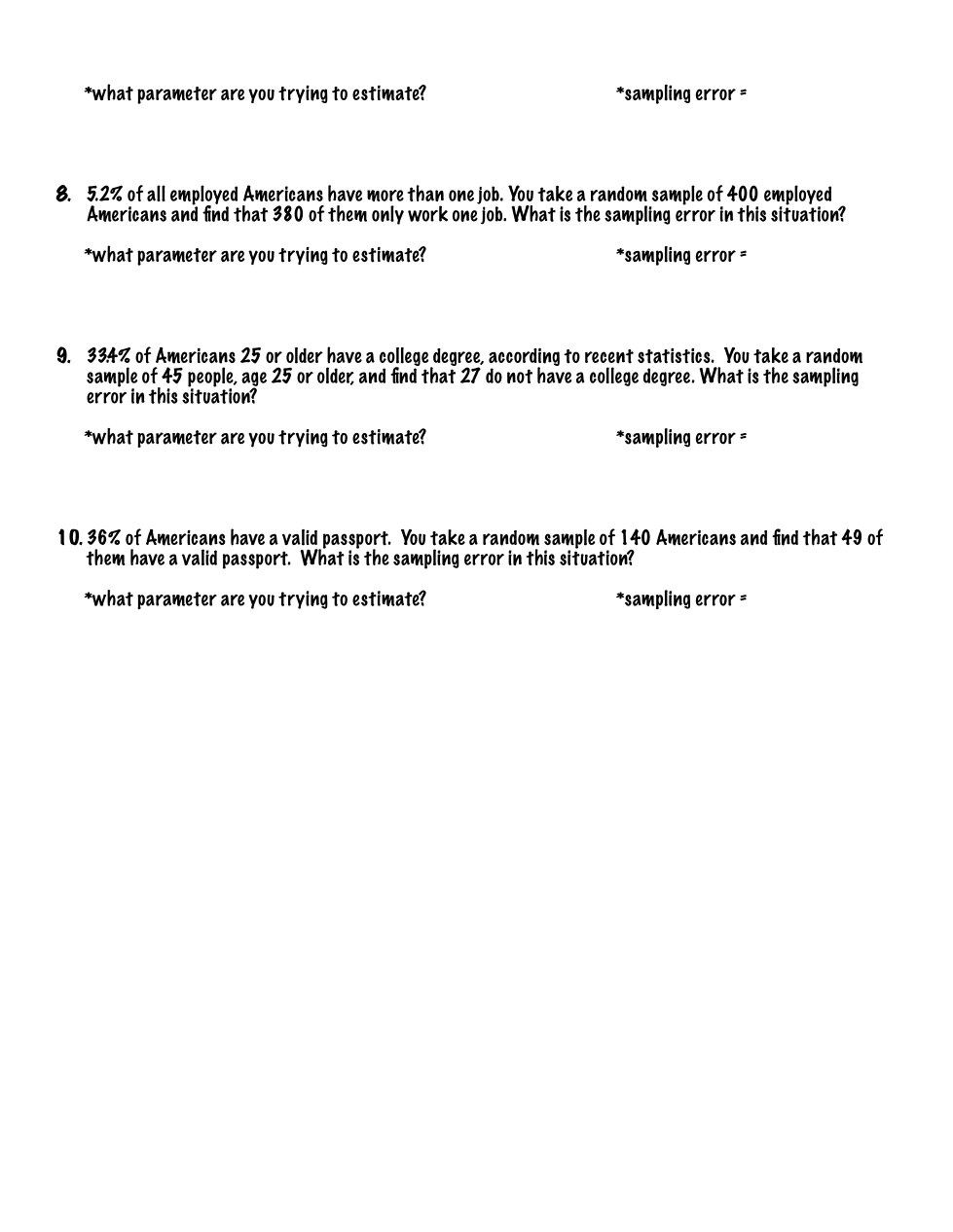 What parameter are you trying to estimate? What was the sampling error for this experiment? Include all calculations needed to support your final answer.