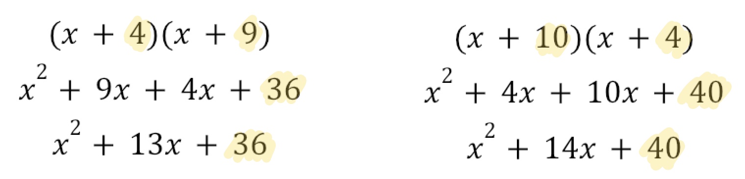 Look at the four problems below. What pattern do you notice about the parts highlighted in yellow?
