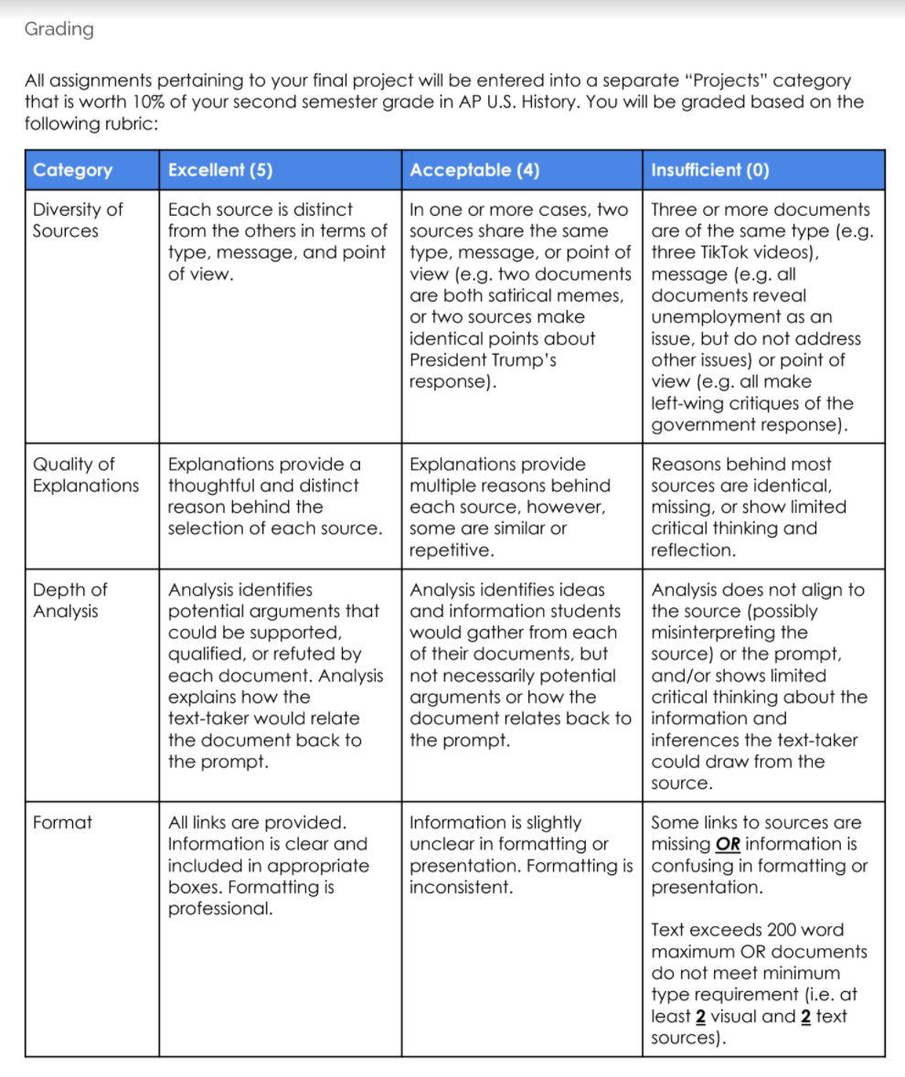 Reflection: How was your experience completing the Reverse DBQ project? Did you enjoy the final assessment? Explain why or why not.