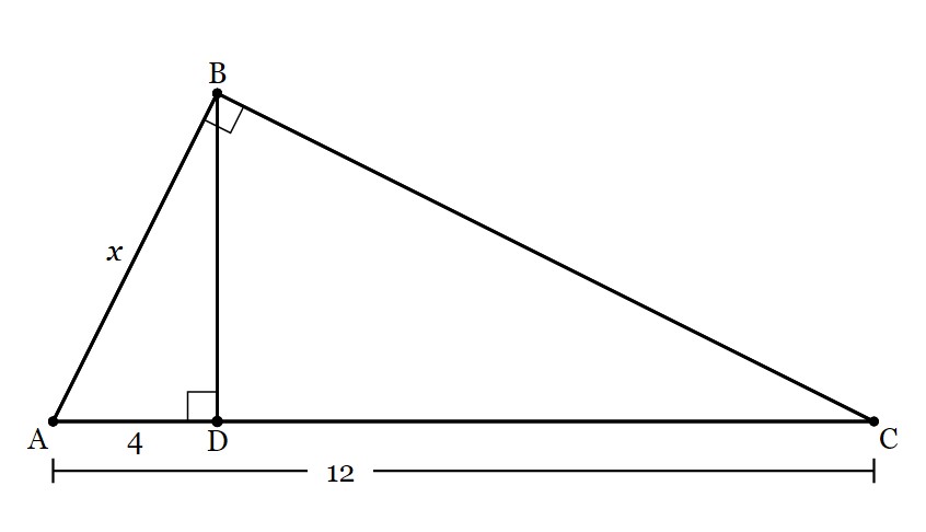 Given right triangle ABC with altitude BD drawn to hypotenuse AC. If AD=4 and AC=12, what is the length of AB in simplest radical form? (Note: the figure is not drawn to scale.)