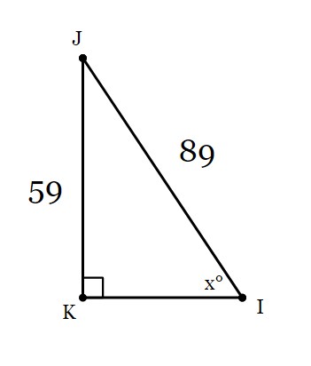 In ΔIJK, the measure of ∠K=90°, JK = 59 feet, and IJ = 89 feet. Find the measure of ∠I to the nearest tenth of a degree.