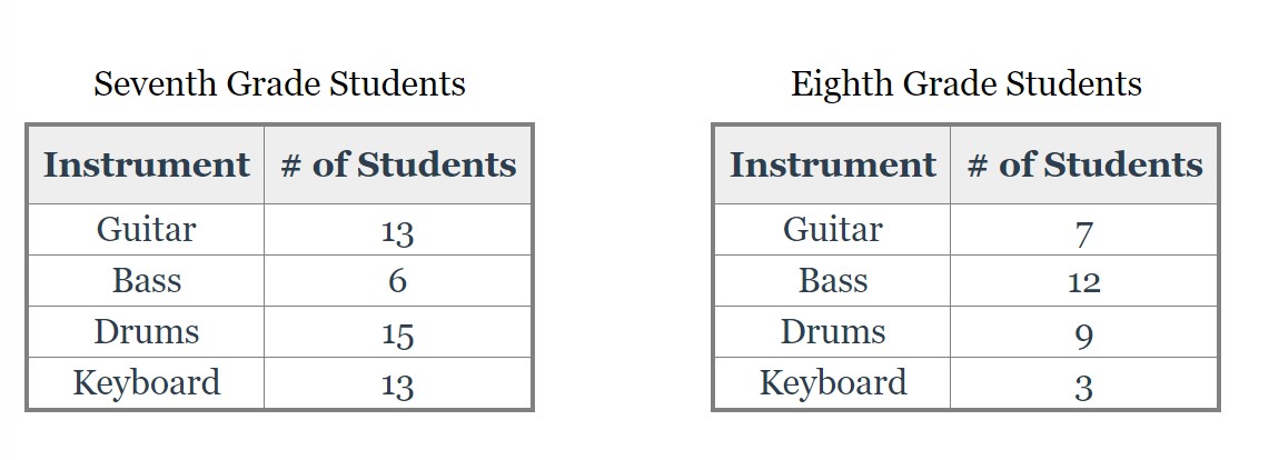 Jayden recorded the grade-level and instrument of everyone in the middle school School of Rock below.