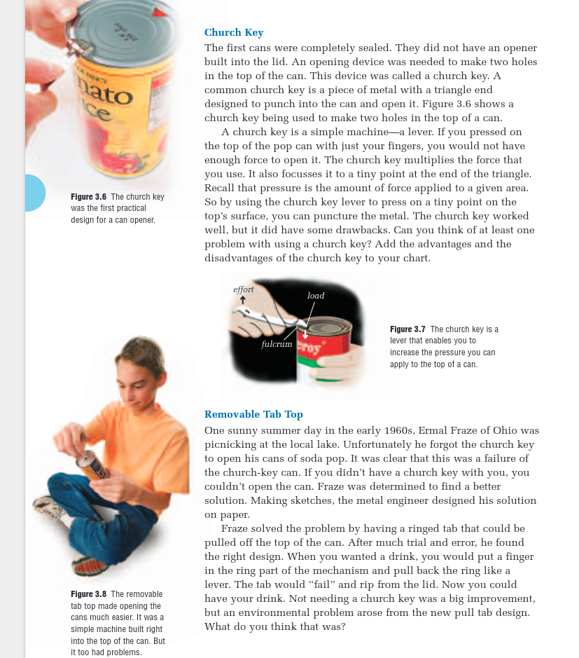 The "church key" was the first practical design for opening a can. It was a simple machine that multiplied the force needed to open the can. The simple machine it was designed after was the ...