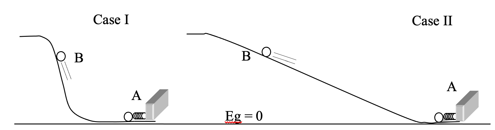 The ramps have two different angles of incline, but Point B is the same height in both ramps.