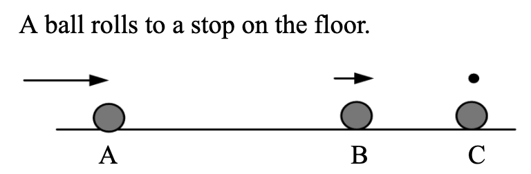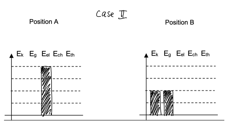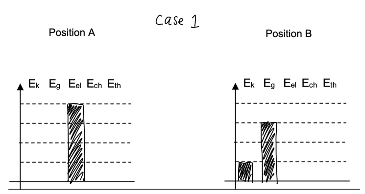 Draw energy bar charts that represent how the energy is stored at locations A, B and C depicted above.