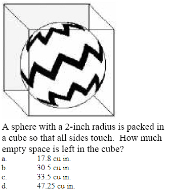 Hint: (1) Find the volume of the cube (use the diameter of the ball for the edge lengths). (2) Find the volume of the sphere. (3) Subtract the volume of the sphere from the volume of the cube.