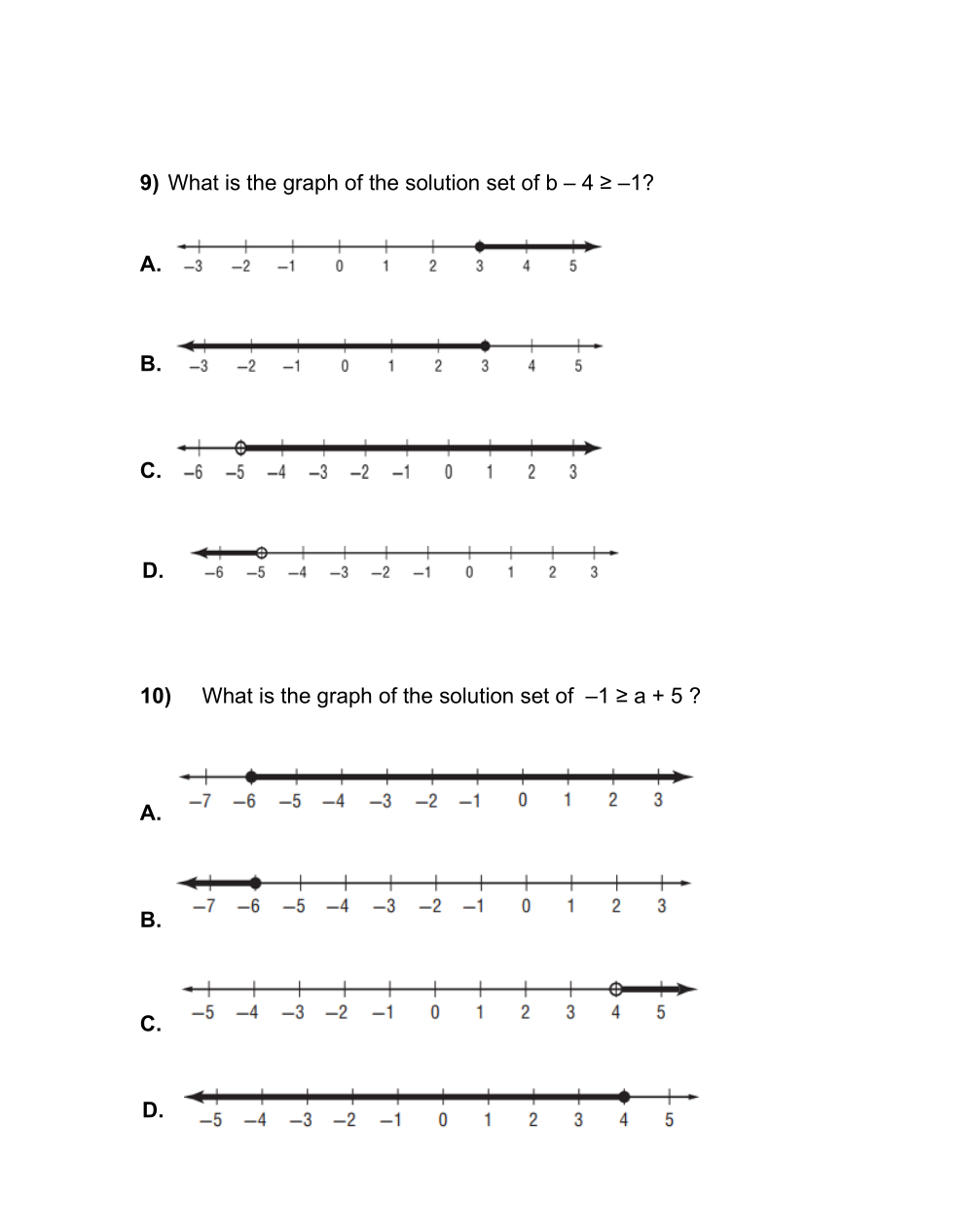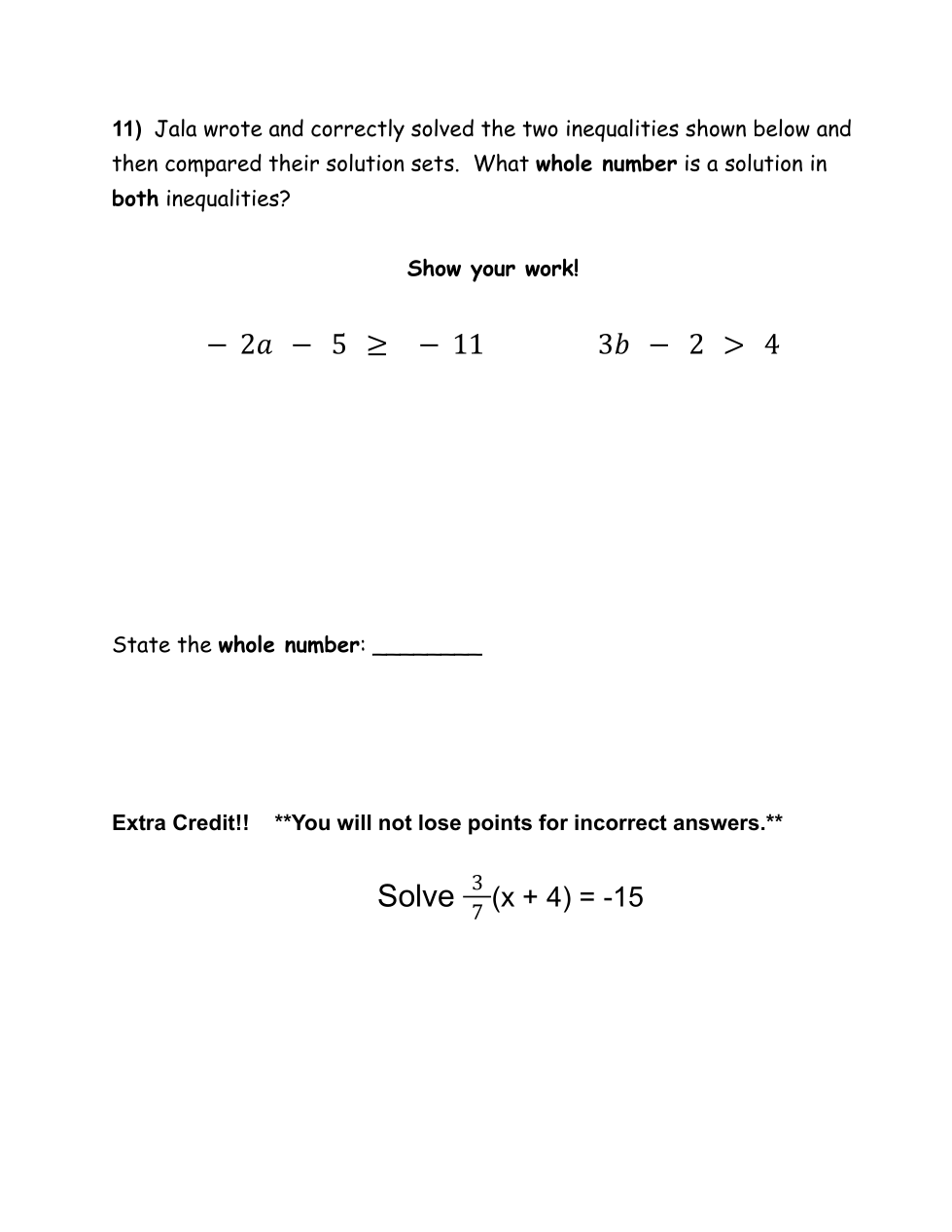 Jala wrote and correctly solved the two inequalities shown below and then compared their solution sets. What whole number is a solution in both inequalities? (look at number 11 on the worksheet to the left)