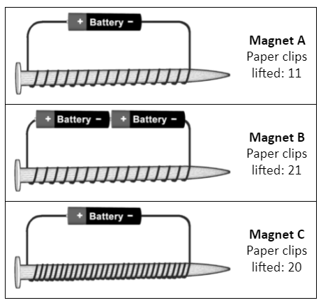 In an experiment to test the construction of electromagnets, the three electromagnets in the diagram were used to lift paperclips. The average number of paperclips each could lift is listed to the right of each diagram. The number of paperclips lifted indicates the strength of the electromagnet (more paper clips = stronger electromagnet).