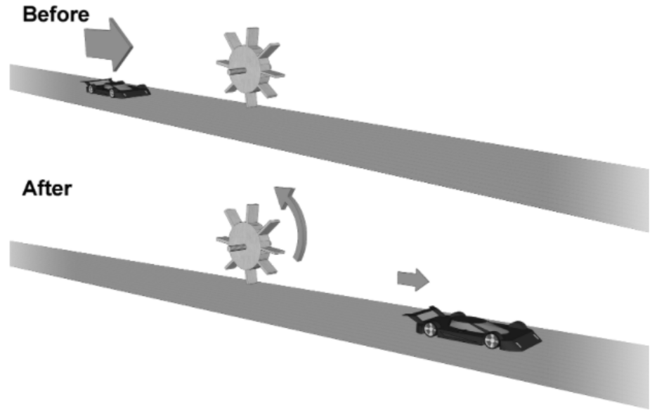 In the after image, the car has contacted the wheel, which begins to spin. The car continues to travel along the track at a slower speed.