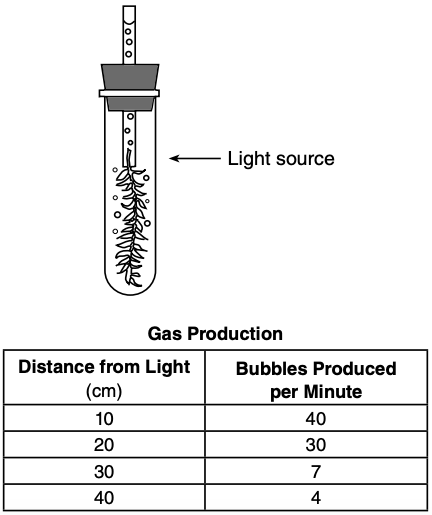 A student placed a test tube containing elodea (an aquatic plant) and pond water 10 cm from a light source. He observed that the plant gave off bubbles of a gas and counted how many bubbles were released in one minute. He moved the plant farther away from the light source to see if distance from the source made a difference. The data table below shows his results.