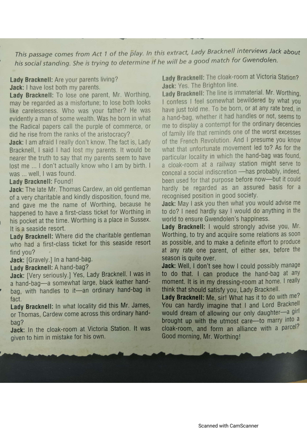 Cash, class and character is one of the themes in The Importance of being Earnest. At the time the play was written, society was changing. This led to lots of new conflicts and opportunities for misunderstandings. Write a 200-250 essay, discuss theme of cash, class and character.