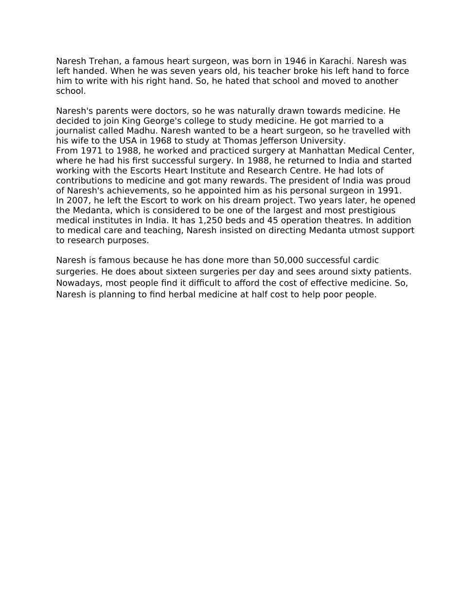 Task 2. Tick the correct option. Naresh studied heart surgery specialization at