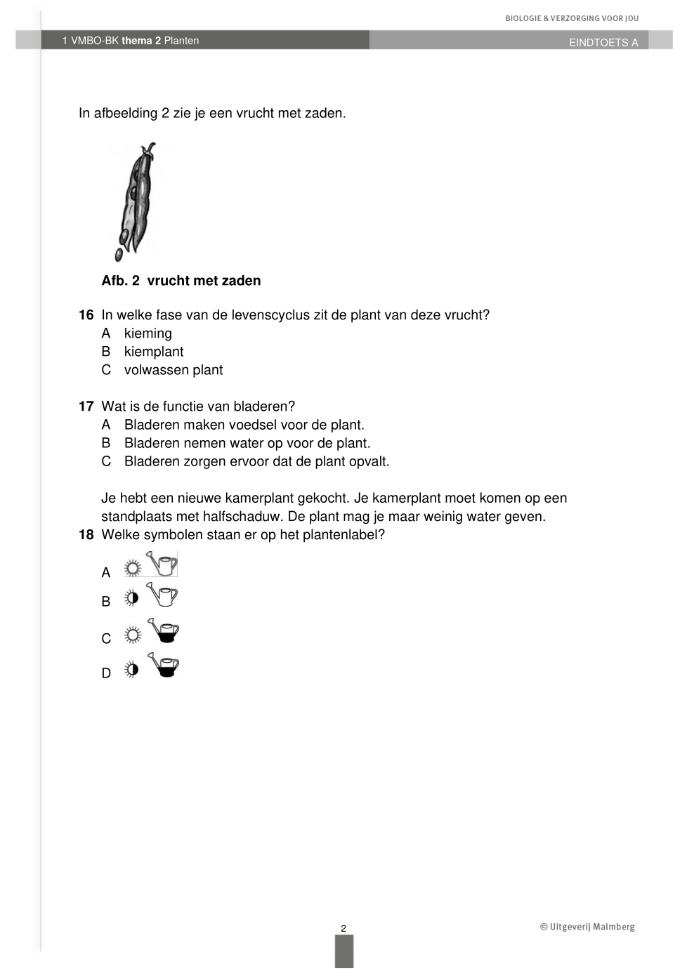 Je hebt een nieuwe kamerplant gekocht. Je kamerplant moet komen op een standplaats met halfschaduw. De plant mag je maar weinig water geven.Welke symbolen staan er op het plantenlabel?