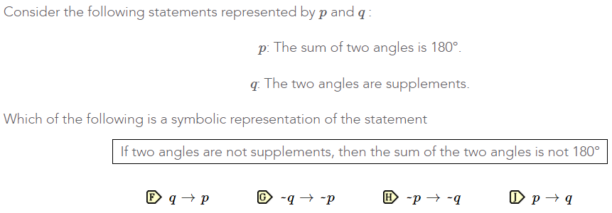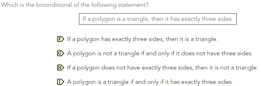 A biconditional statement symbol looks like p<->q...uses the words 'if and only if'...select the options that 'looks' most like the symbol and uses the words 'if and only if'...DO NOT MAKE ANYTHING THE OPPOSITE!!!