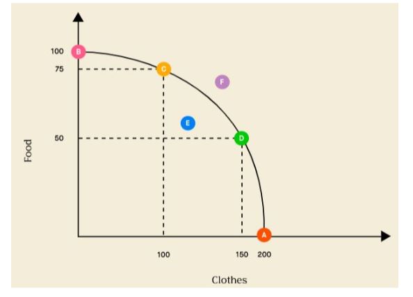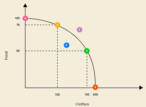If all resources are split between clothes and food, how many units of each can be made? Answer as (C, F)