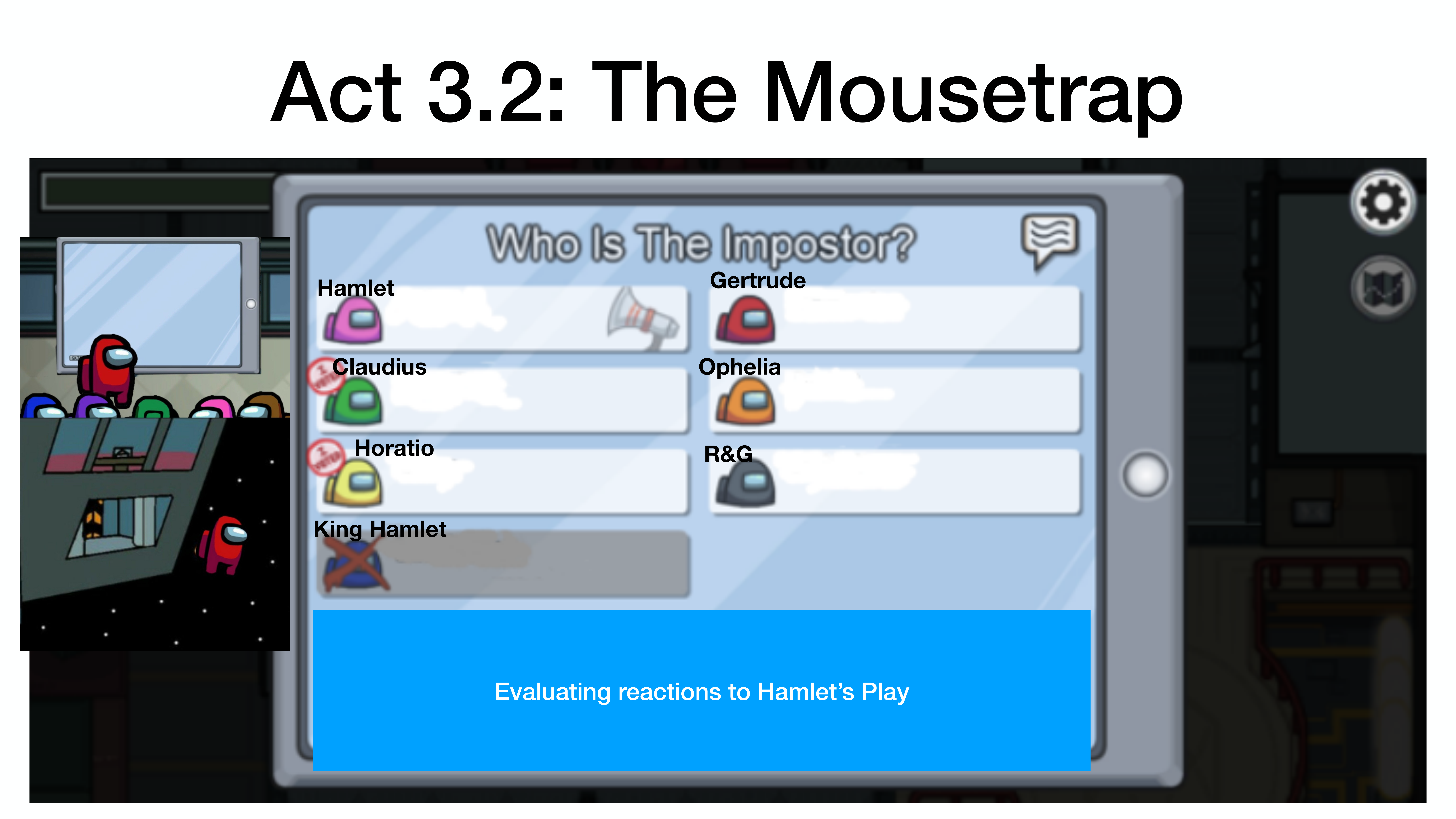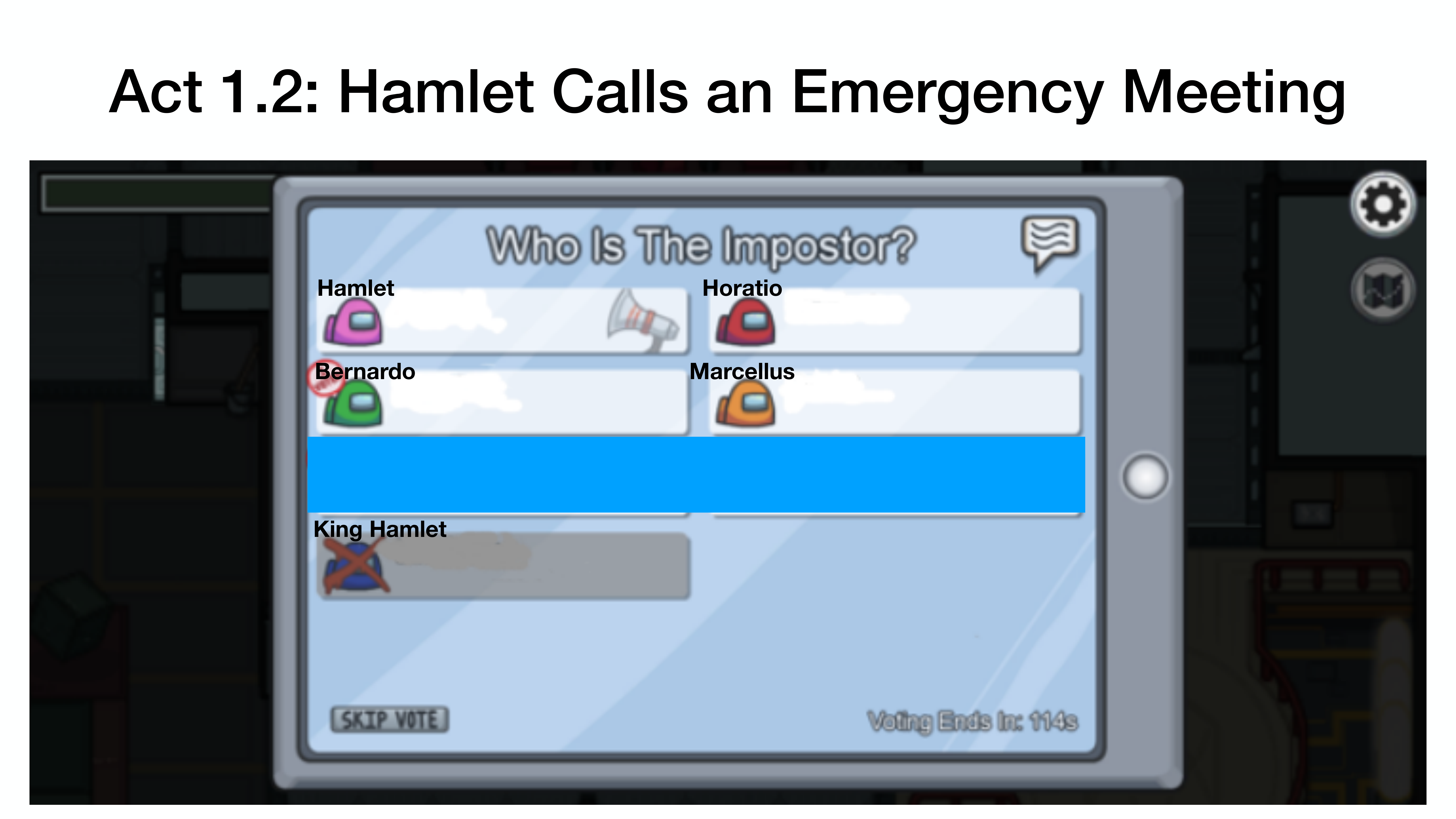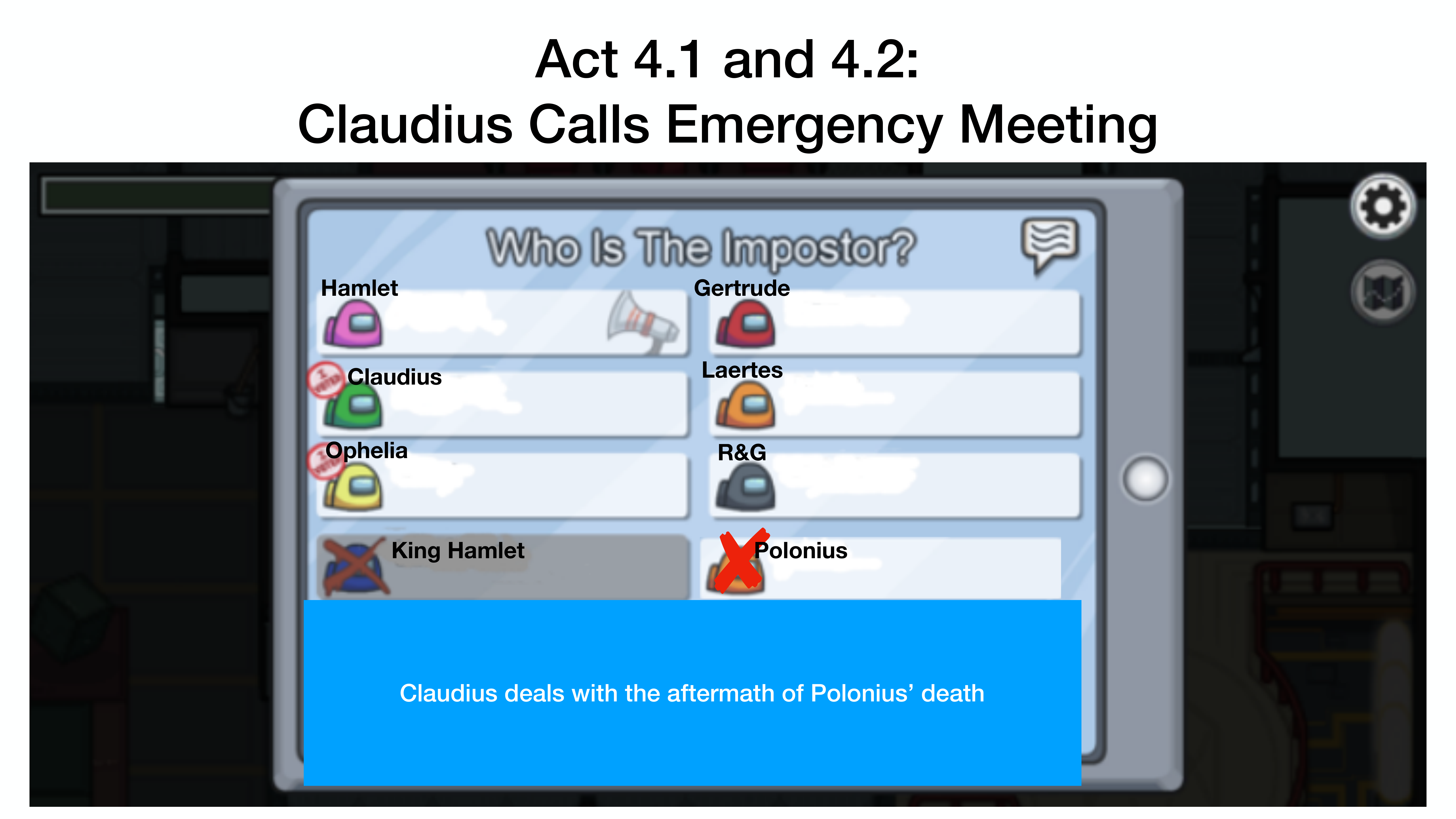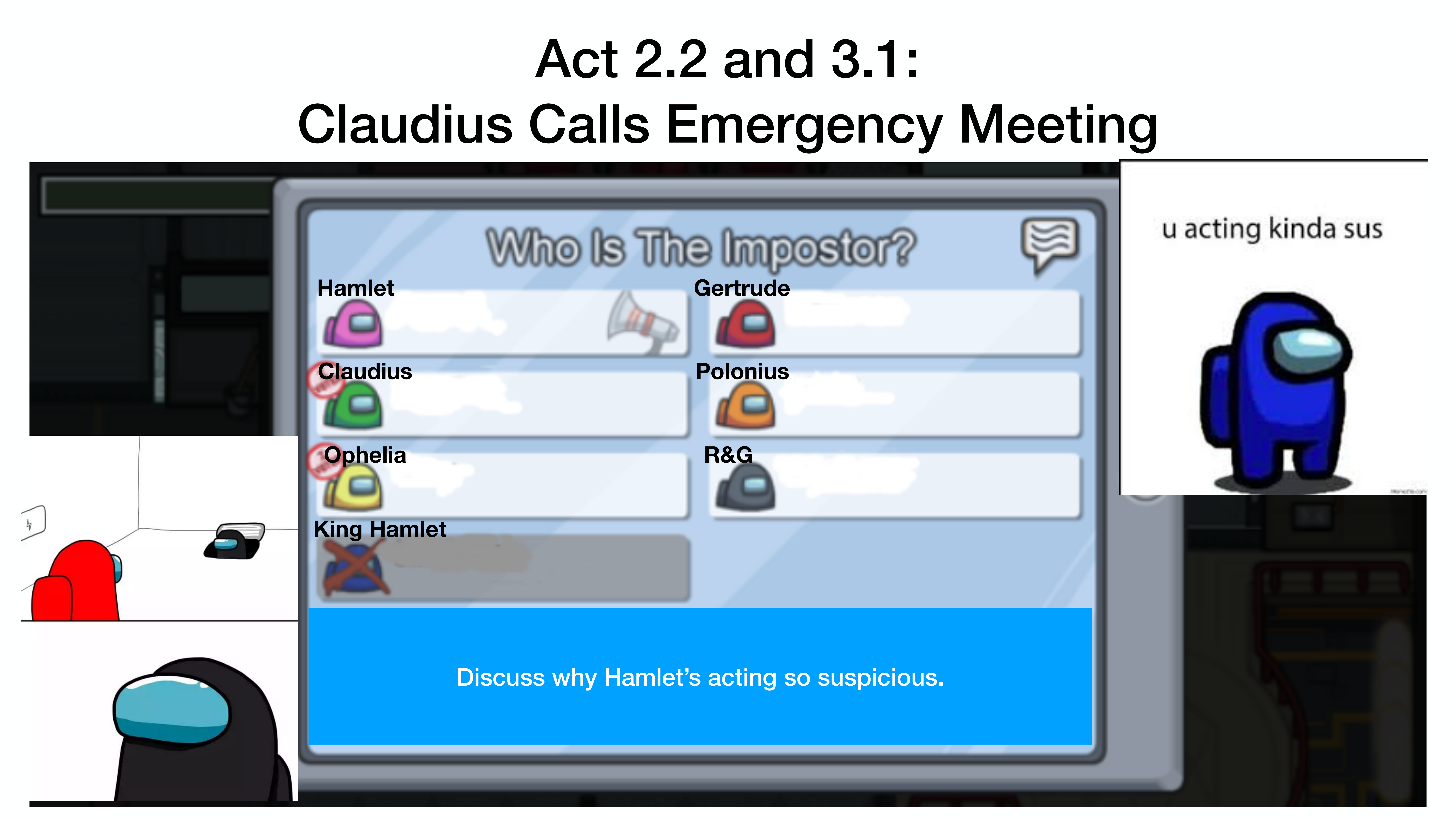 Recreate their reactions to Hamlet's play. Make sure to include the dialogue of each character as if they are in an Emergency Meeting.