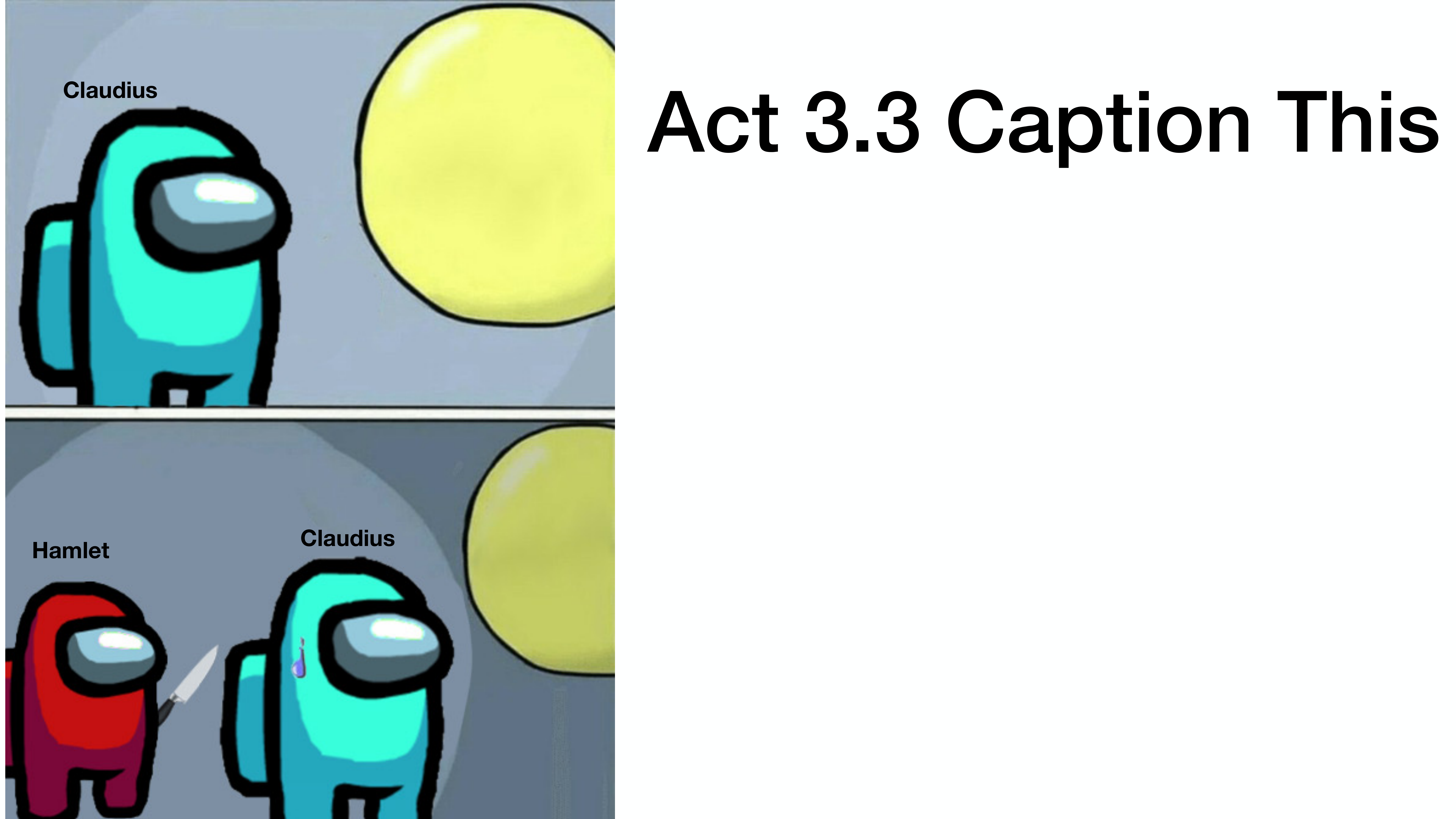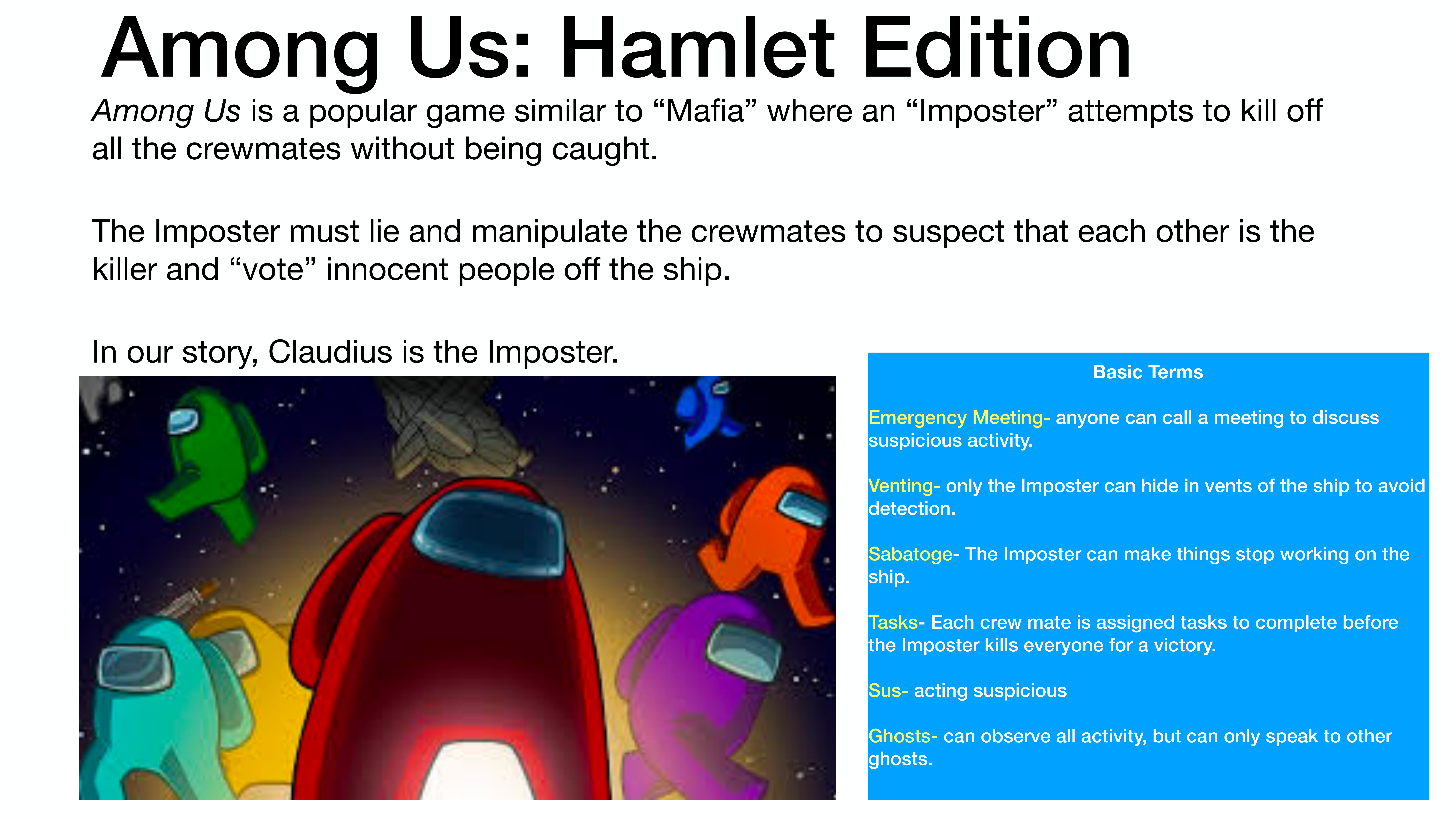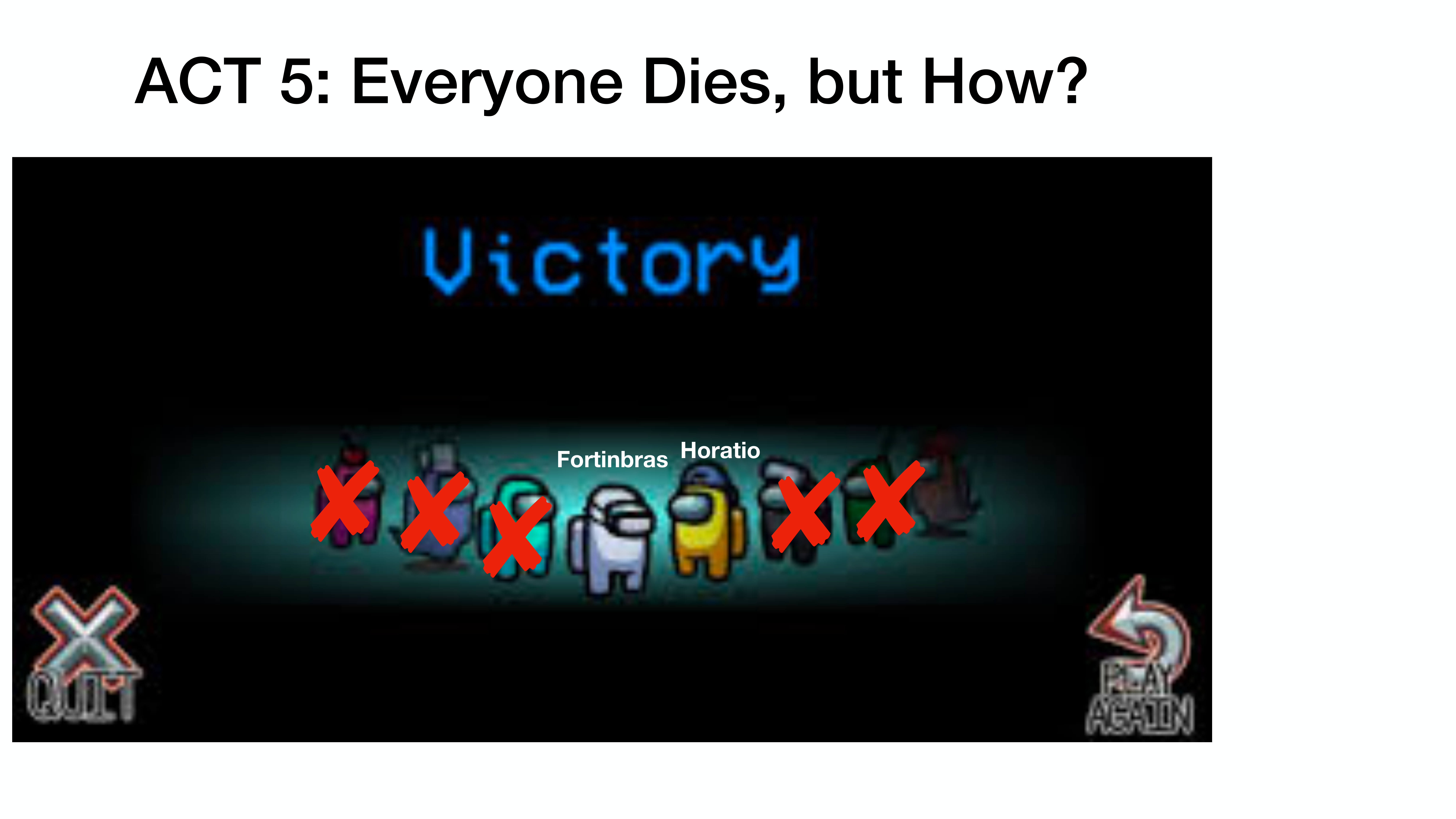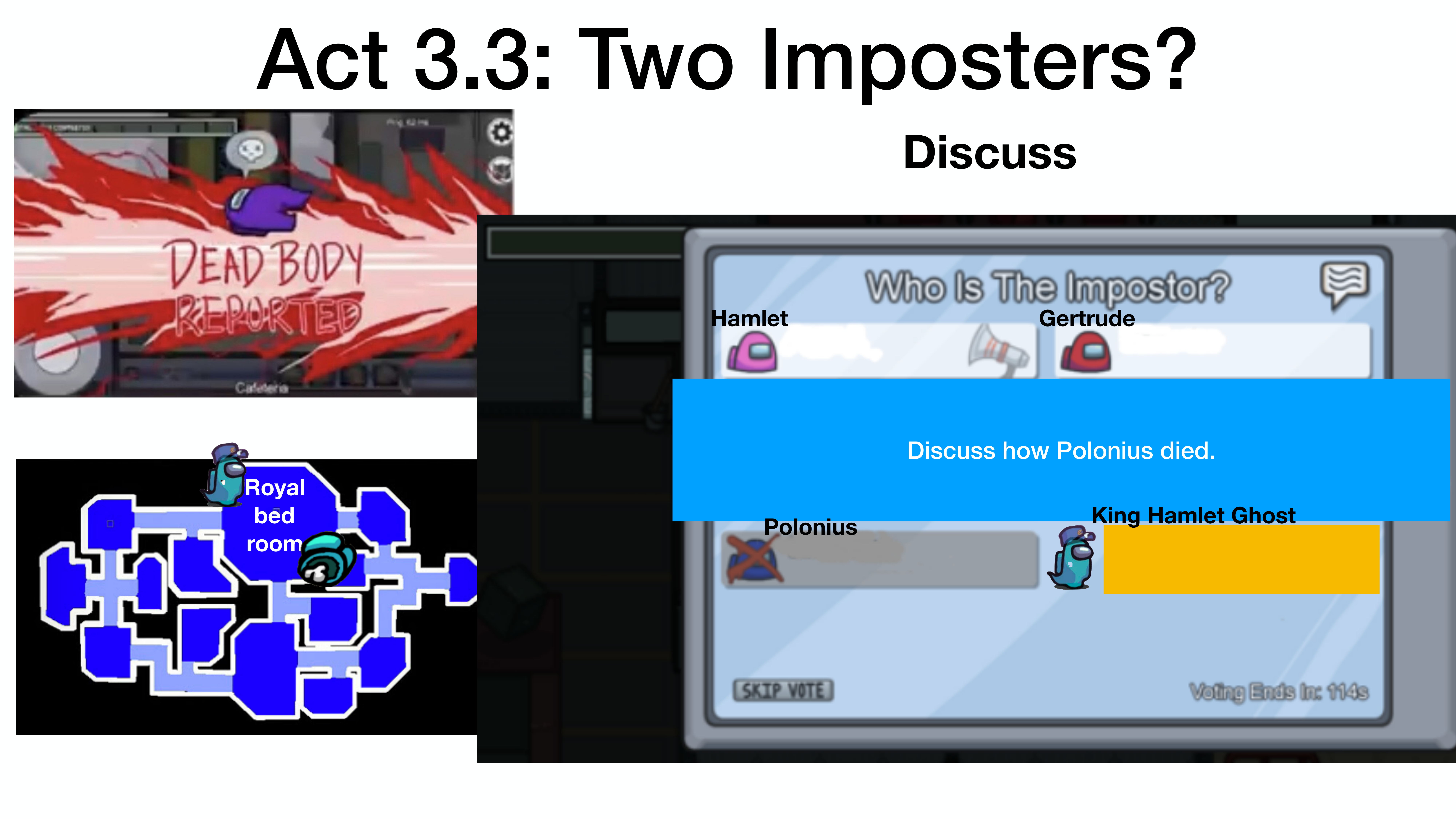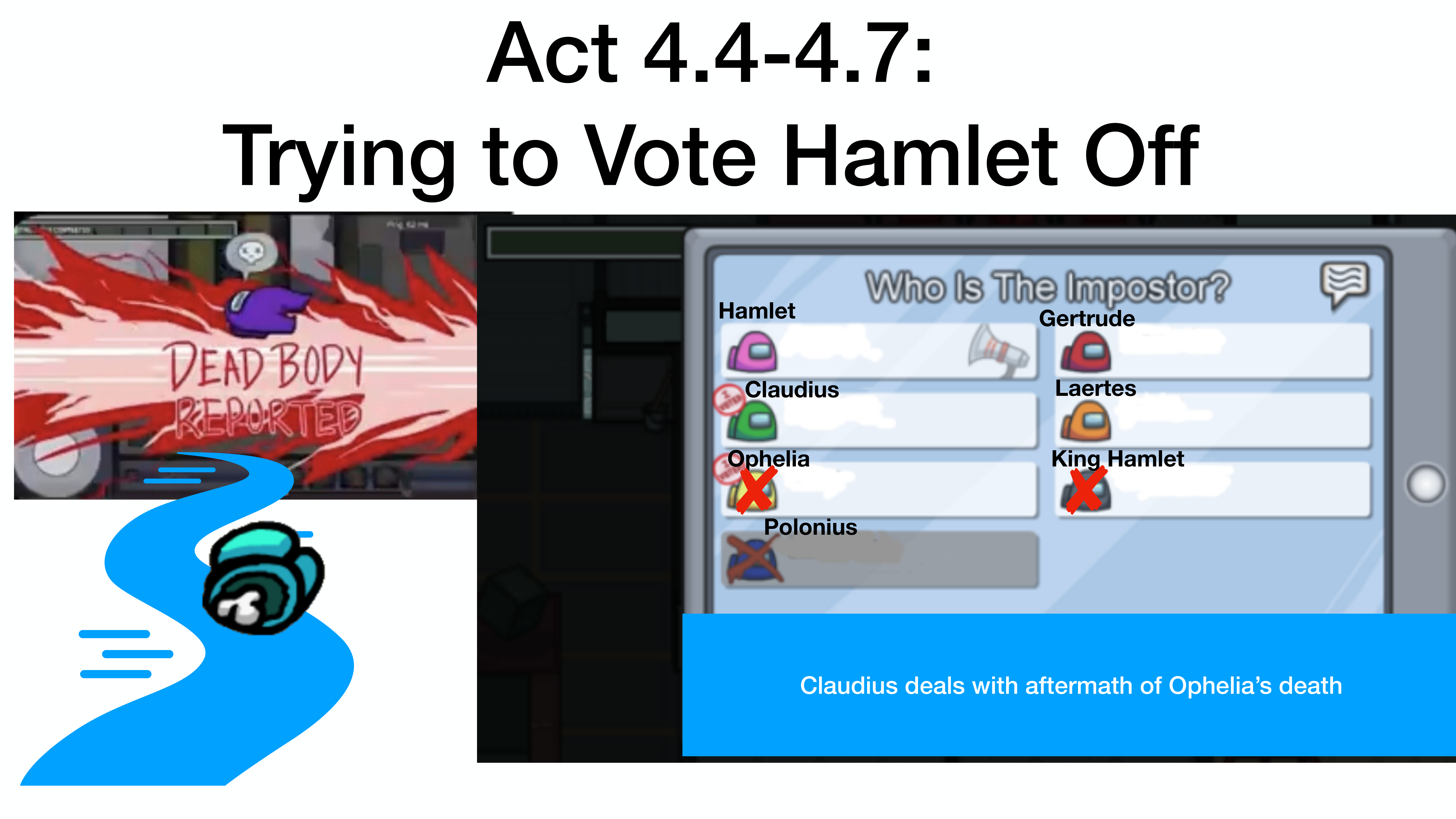 Recreate their reactions to Hamlet's play. Make sure to include the dialogue of each character as if they are in an Emergency Meeting.