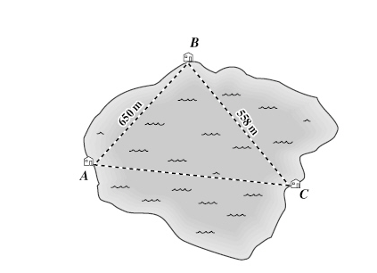 The locations of three water pumping stations form a triangle on a map of the area. The distance from station A to station B is 650 meters. The distance from station B to station C is 558 meters. The distance from station A to station C is -