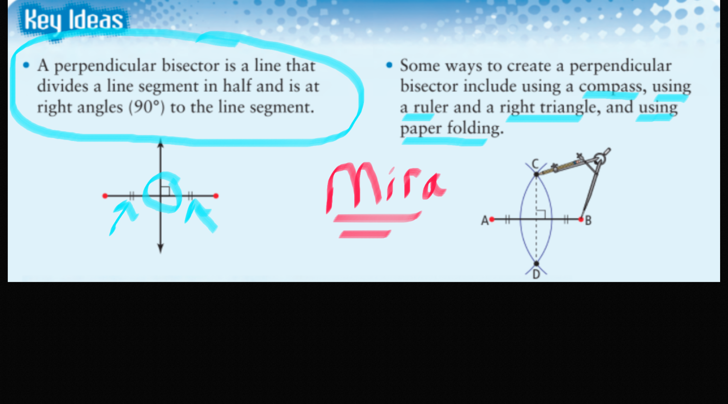 Draw any line segment MN.Use the "LINE TOOL" to draw the perpendicular bisector of MN. Include ALL labels