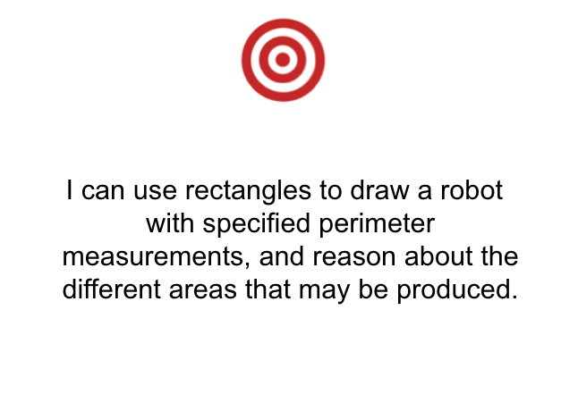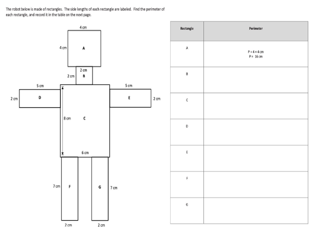 The robot is made of rectangles. The side lengths of each rectangle are labeled. Find the perimeter of each rectangle, and record it in the table on the next page.