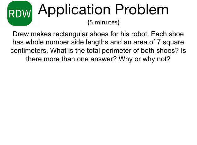 Drew makes rectangular shoes for his robot. Each shoe has whole number side lengths and an area of 7 square centimeters. What is the total perimeter of both shoes? Is there more than one answer? Why or why not?
