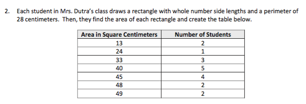 Give two examples from Mrs. Dutra’s class to show how it is possible to have different areas for rectangles that have the same perimeter.
