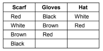 This table shows the colours of the 4 scarves, 3 pairs of gloves, and 2 hats that Tamara has.