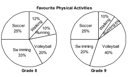 These 2 circle graphs show the most popular physical activities that Grade 8 and Grade 9 students participate in.