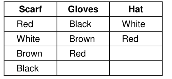 This table shows the colors of 4 scarves, 3 pairs of gloves, and 2 hats that Tamara has. She randomly picks a scarf, a hat, and a pair of gloves. What is the probability of Tamara choosing a pair of black gloves and a red scarf?