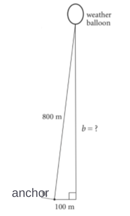 A weather balloon is anchored by a cable 800 m long. The balloon is flying directly above a point that is 100 m from the anchor. How high is the balloon flying? Give your answer to the nearest meter.